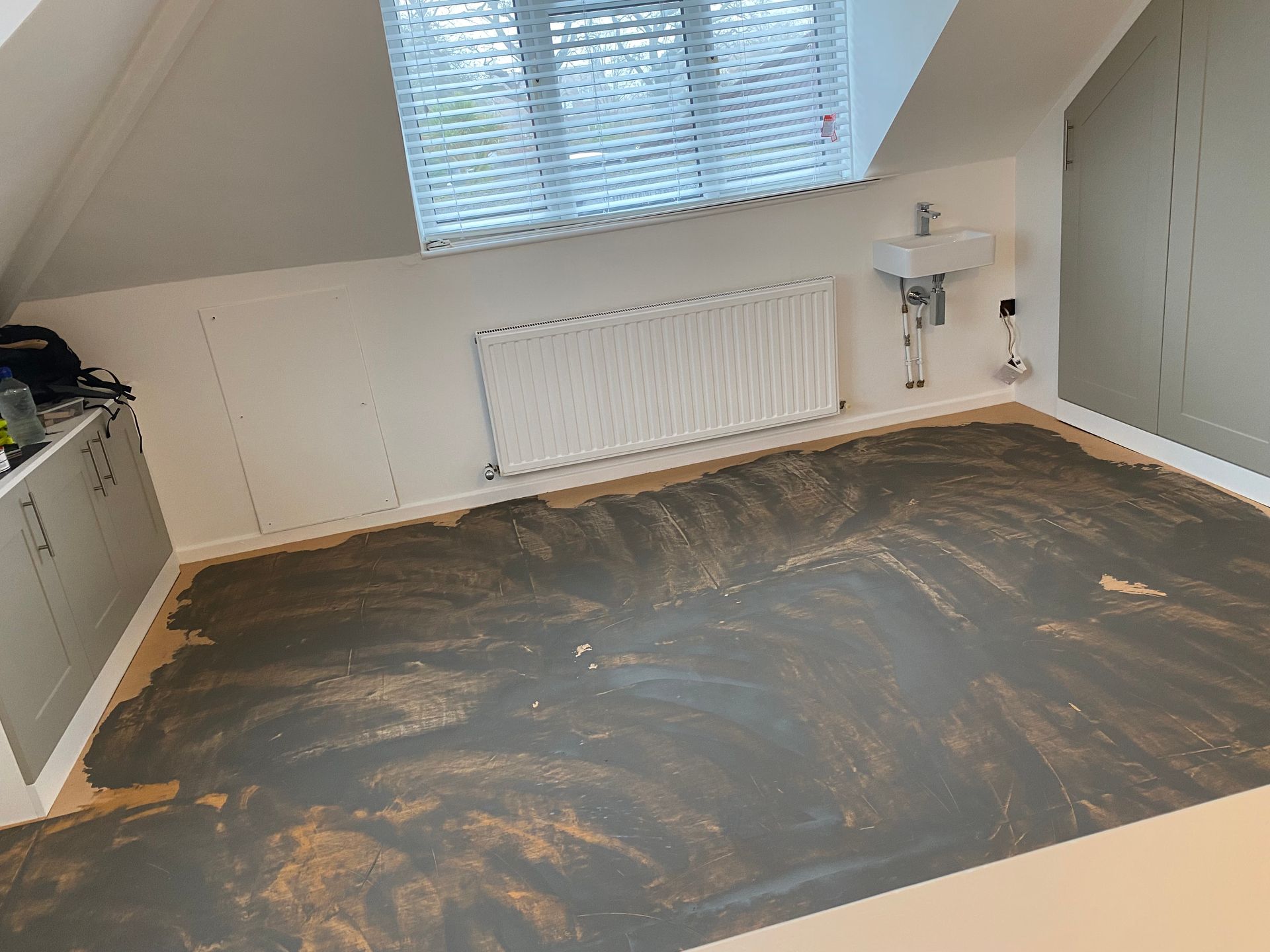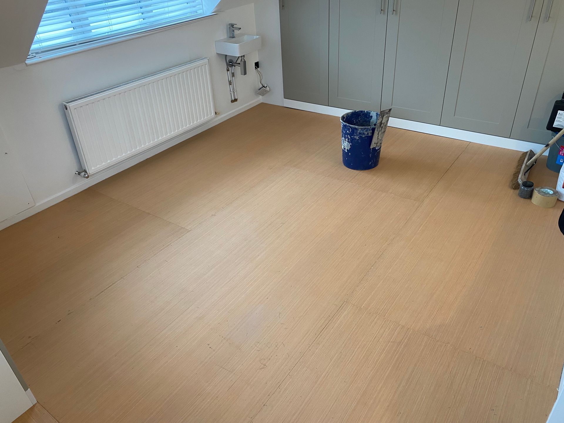 CUSHION FLOOR JOB COMPLETED IN HORNCHURCH TO LOFT ROOM AREA, PREPPED WITH 6mm PLY, FINISHED WITH A LEVELLING COMPOUND, THEN A NICE BEAD OF MASTIC AROUND THE PERIMETER.