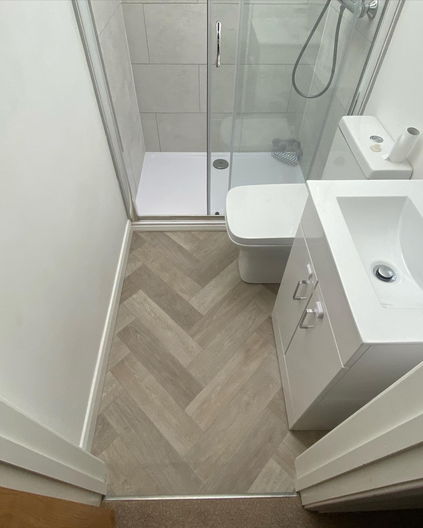 SHEET VINYL JOB COMPLETED IN ONGAR TO ONE FAMILY BATHROOM AND AN EN SUITE. PLYWOOD SHEETS SCREWED DOWN AND JOINTS FEATHERED WITH A FINISHING COMOUND READY FOR THIS BEAUTIFUL HERRINGBONE SHEET CUSHION FLOOR. FINISHED OFF WITH A NICE BEAD OF MASTIC.