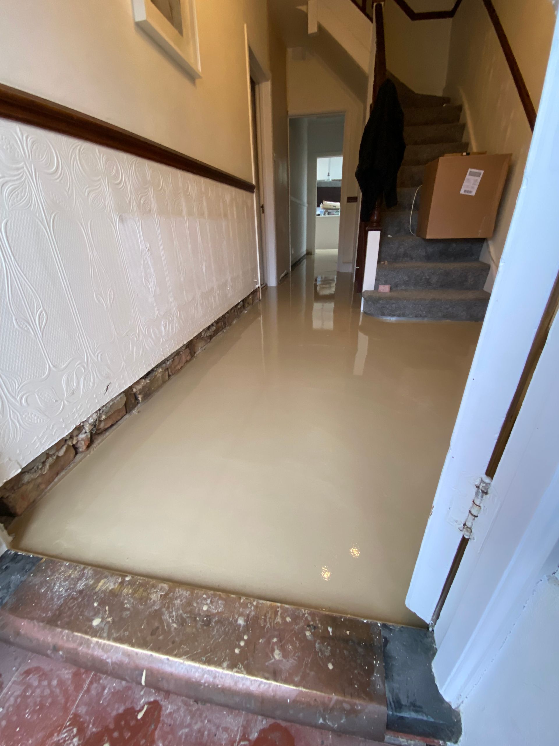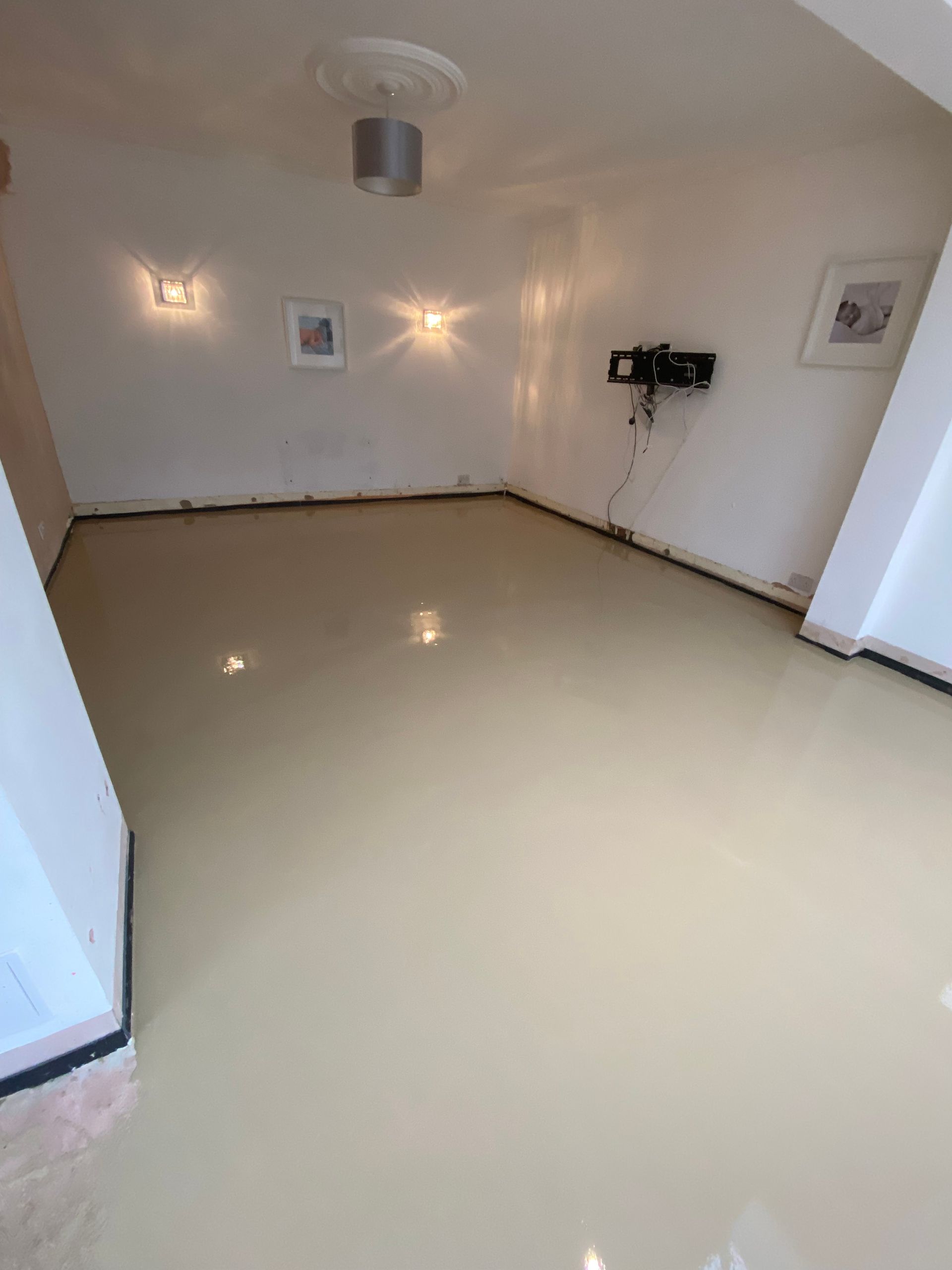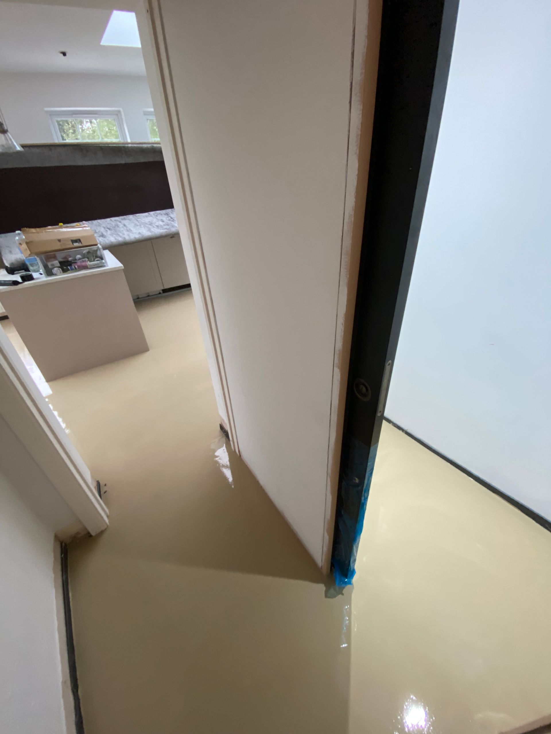 SCREEDING PREP COMPLETED IN UPMINSTER, 77m2 OF A FULL 8mm LATEX SCREED OVER NEW UNDERFLOOR HEATING TO HALLWAY, UTILITY, BATHROOM, KITCHEN AND LIVING/DINNING AREA. ALL READY FOR A BEAUTIFUL HERRINGBONE LVT WITH BORDER AND ACCENT STRIP.